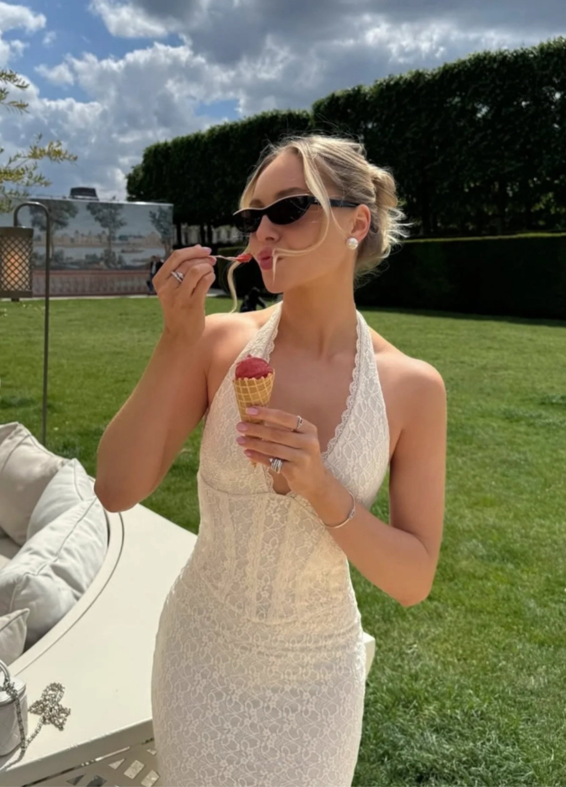 This corset-style maxi dress blends refined structure with romantic softness. Crafted from premium stretch lace layered over smooth jersey, it contours beautifully to the body while offering comfortable movement. The fishtail silhouette enhances the curves, while delicate scalloped trims highlight the plunging halter neckline for an elevated, feminine finish.