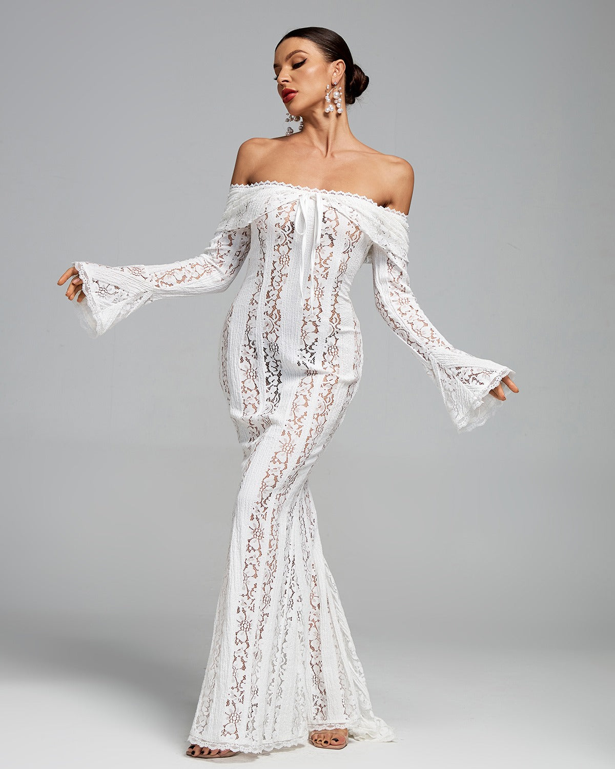Questo lussuoso abito lungo in pizzo unisce la raffinatezza classica alla femminilità contemporanea. Realizzato in pizzo floreale elasticizzato che avvolge delicatamente il corpo, offre una silhouette raffinata e valorizzante. La scollatura a spalle scoperte e il bustino strutturato esaltano il décolleté con un tocco chic e romantico, mentre le sottili maniche a sbuffo aggiungono movimento aggraziato e un fascino raffinato, perfetto per matrimoni, serate di gala e occasioni speciali.