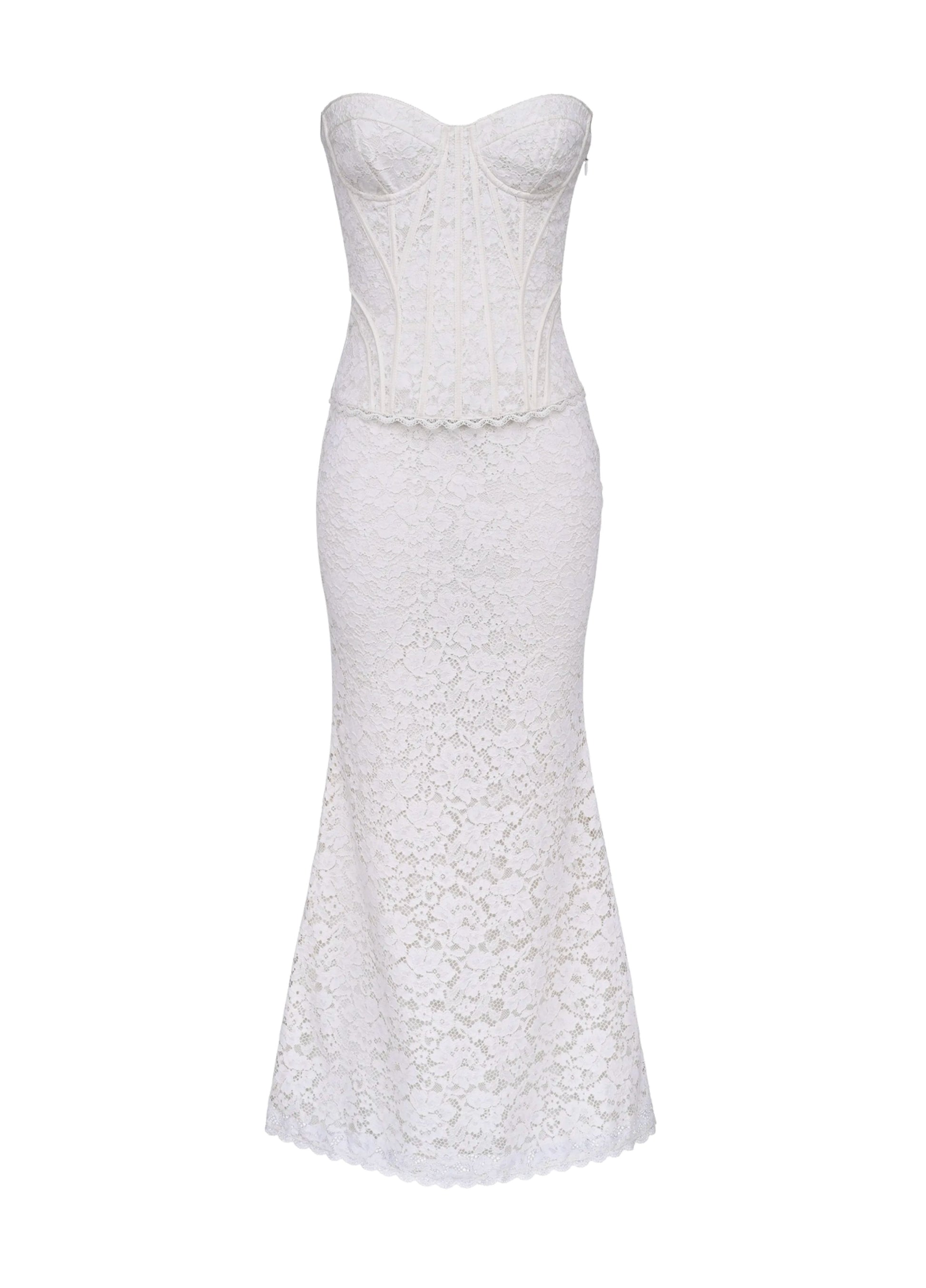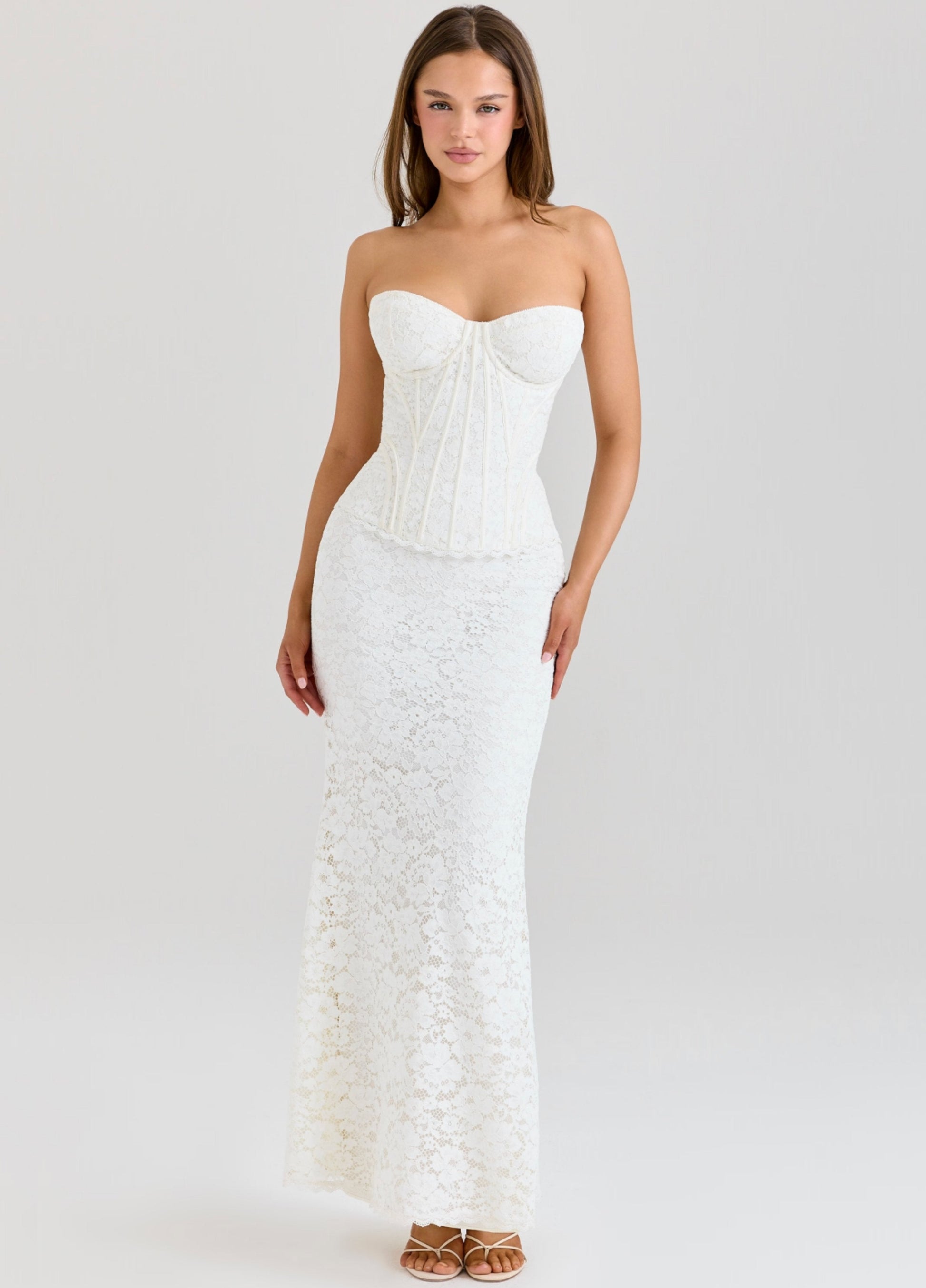 This ivory lace maxi dress blends intricate craftsmanship with a beautifully structured silhouette. Crafted from corded lace, it features a boned corset that defines the waist, an underwired bust for refined support, and a lace-up back that creates a contoured, adjustable fit. The floor-length skirt flows gracefully and is finished with delicate scalloped lace trims for a romantic, timeless touch.